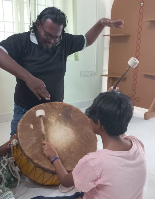 Newton trains our children in folk art, mainly Thudumbattam, bringing his rich experience as a professional theatre and folk performing artist since 2004. With a keen eye for identifying and nurturing talent, he has worked with both neurotypical and neurodiverse children, helping them develop their artistic expression. He has performed in over 1,000 street theatre shows. Beyond his expertise, Newton is a compassionate teacher who blends skill, patience, and encouragement to inspire every child he trains.