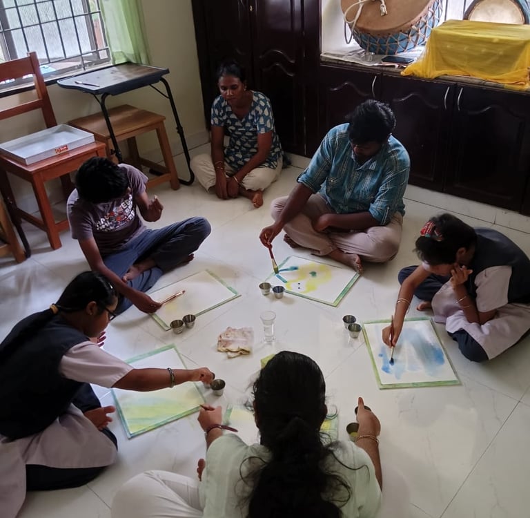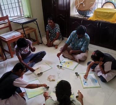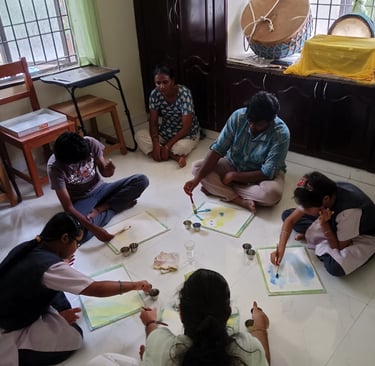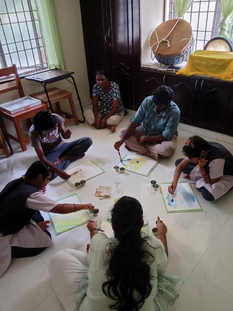 Children are introduced to culture through celebrations, festivals, storytelling, music, folk arts, and practices such as Kolam, which build rhythm, attention, aesthetic sense, and grounding. These activities are carefully chosen to support psychological well-being by providing structure, familiarity, and emotional safety. They also offer natural avenues for expressiveness, allowing children to communicate feelings, creativity, and inner states in non-verbal and verbal ways.